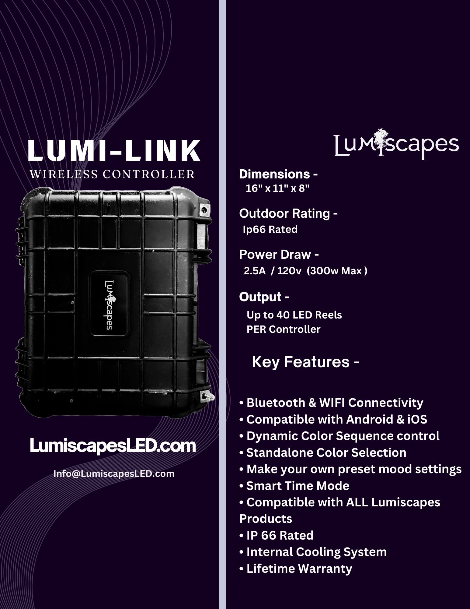 The Lumi-Link Controller is our most popular option, giving you complete wireless control over your display. With a simple push of a button, you can select from limitless designs and color schemes to create your perfect setup effortlessly. This controller is also IP66 Rated and great for all year use.
